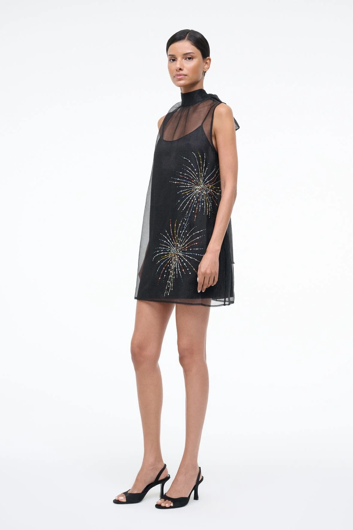 The Albee Mini Dress is an organza sleeveless dress featuring a high neck with a functional tie in the back. This style is sheer and features an interior slip.