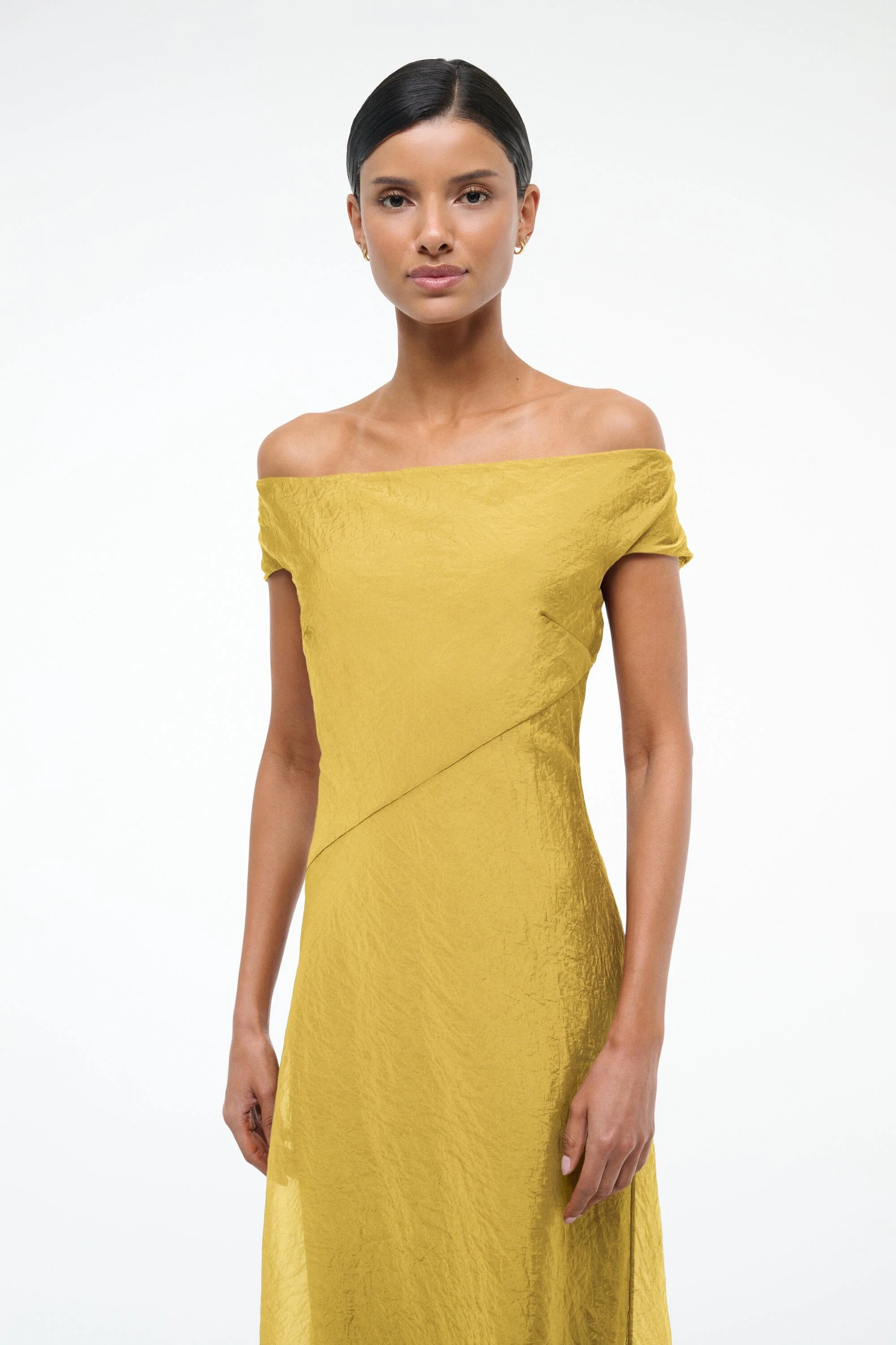 This is an off-the-shoulder maxi length dress crafted from a sheer organza. The Cheyenne is cut on the bias for a flattering fit.