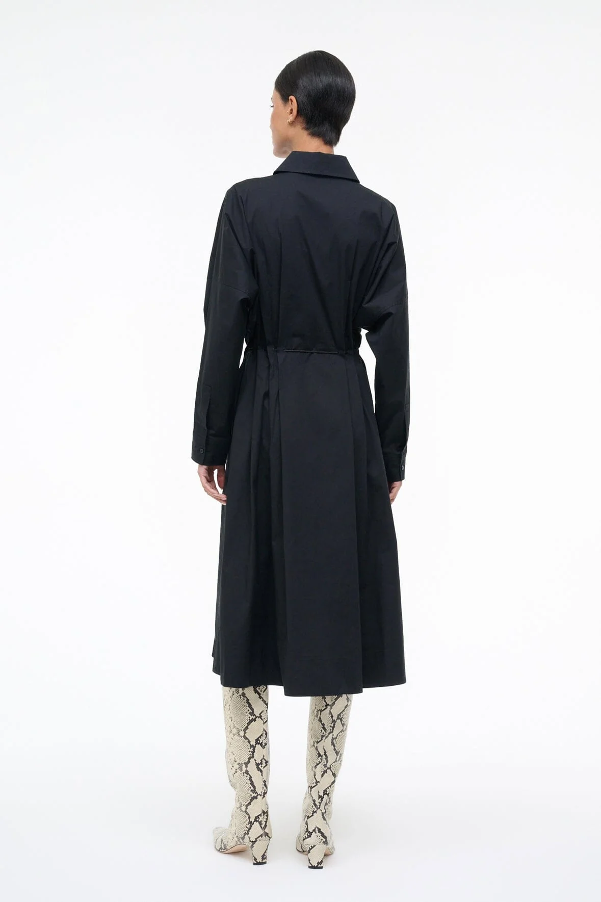 The Chi Midi Dress is a crisp stretch poplin dress with a classic collared neckline and front zipper closure. Defined pleats and an adjustable waist tie create a flattering silhouette.