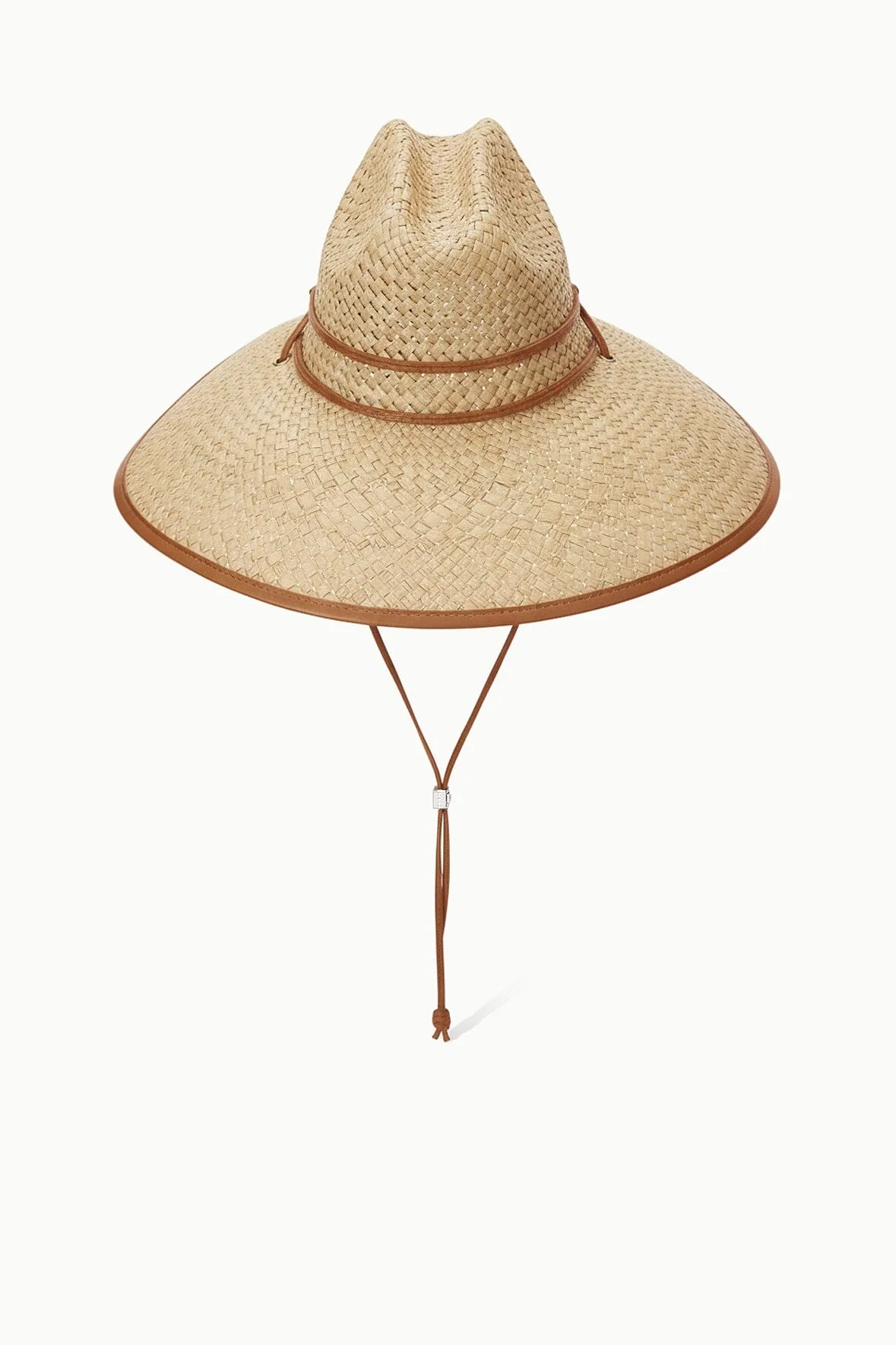The Cove Hat is a wide-brim woven straw hat with leather trim. This style features a chin strap with signature metal hardware.Â