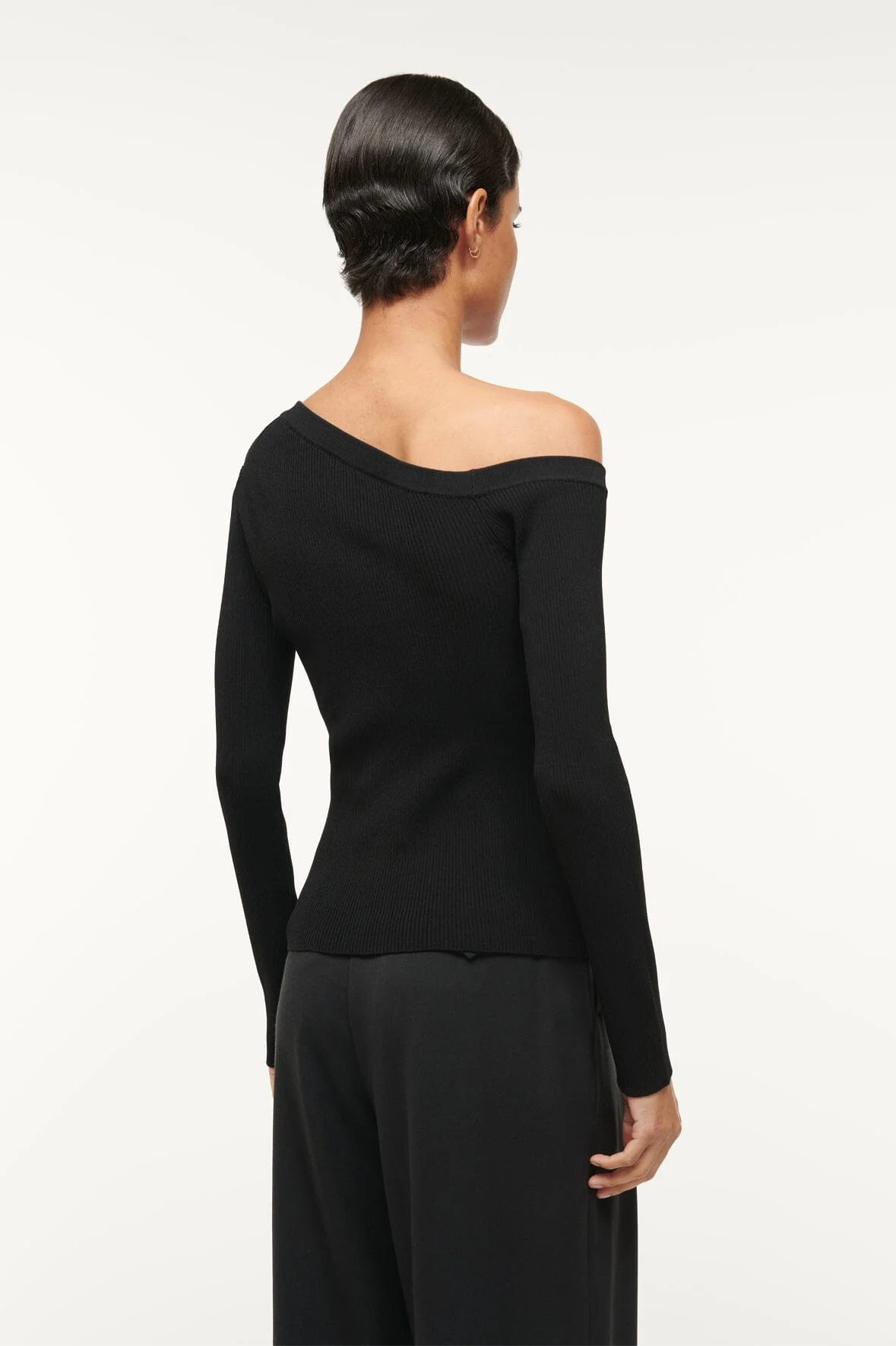 The Craftsman Sweater is our chic update to a classic fitted cardigan. This style is an off-one-shoulder button up cardigan.