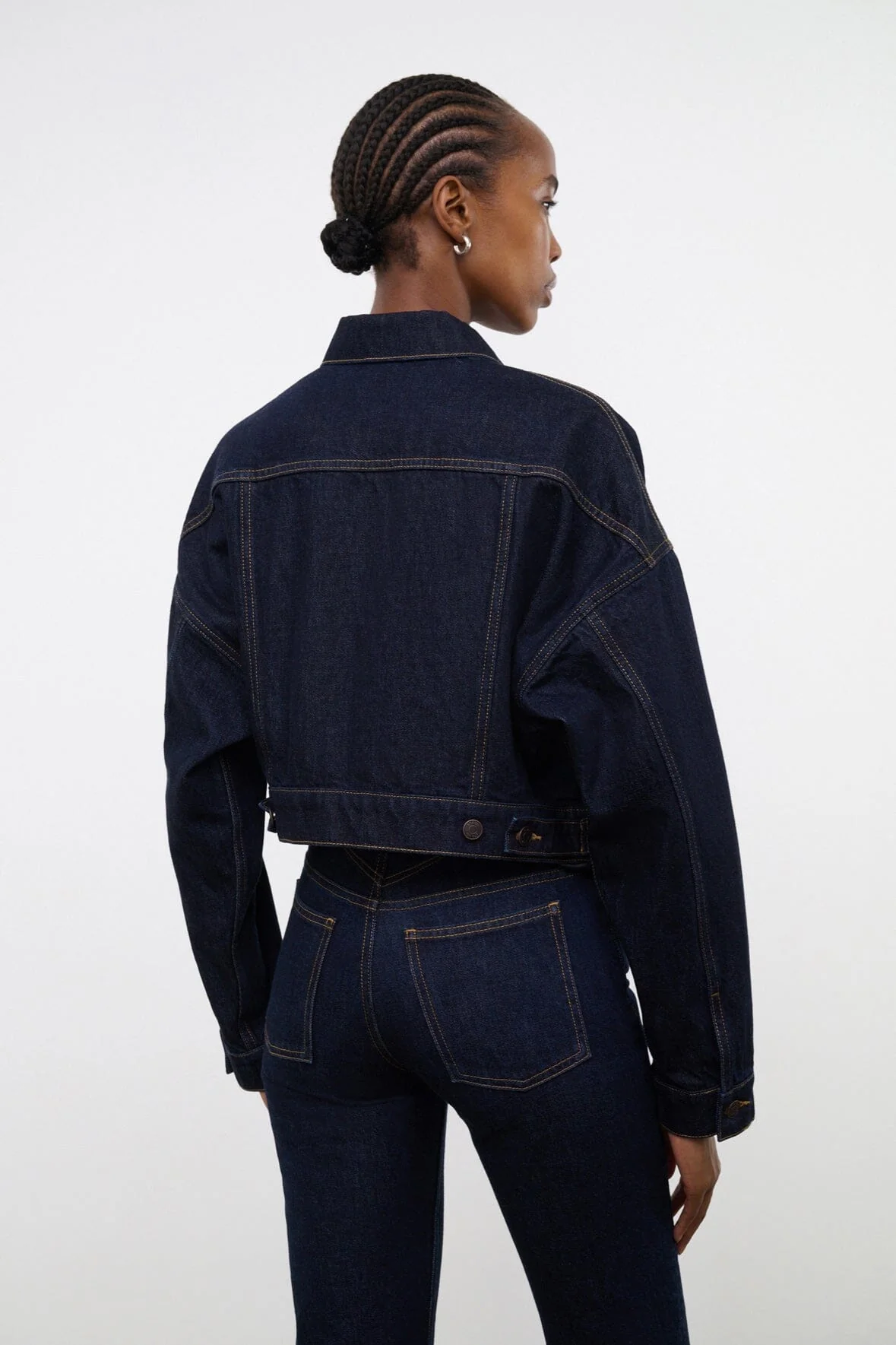 A classic, reimagined. The Glen Jacket is cut from rigid Italian denim in a cropped silhouette with signature V-hem. It has a fitted body with roomy drop sleeves for a relaxed feel. Match it back to our V-waist jean, The Jackson.