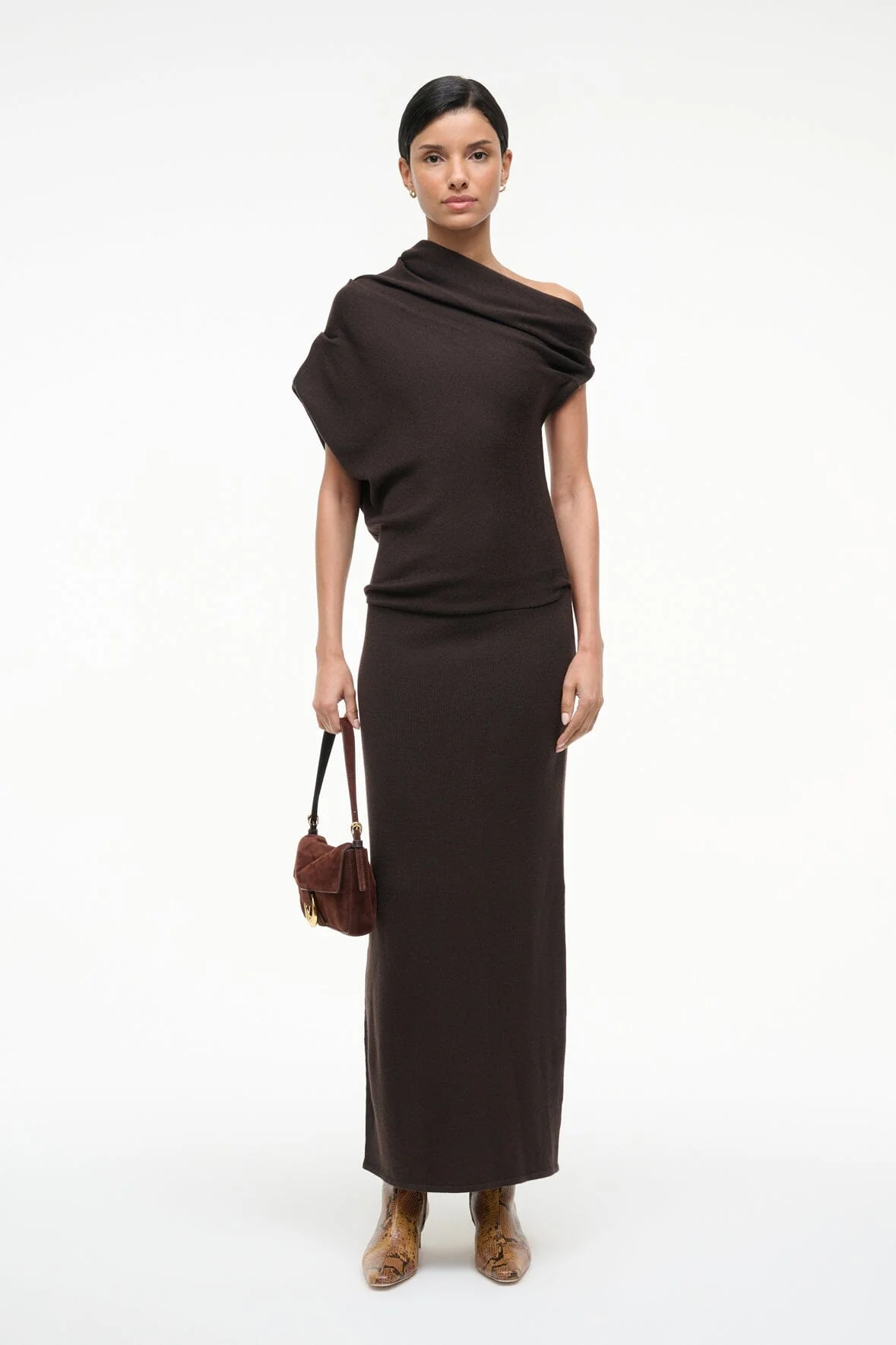 The Mable Dress is a new sweater dress silhouette. Knit in soft merino wool, the Mabel offers an asymmetrical off the shoulder sleeve and delicate draping throughout the body.Â