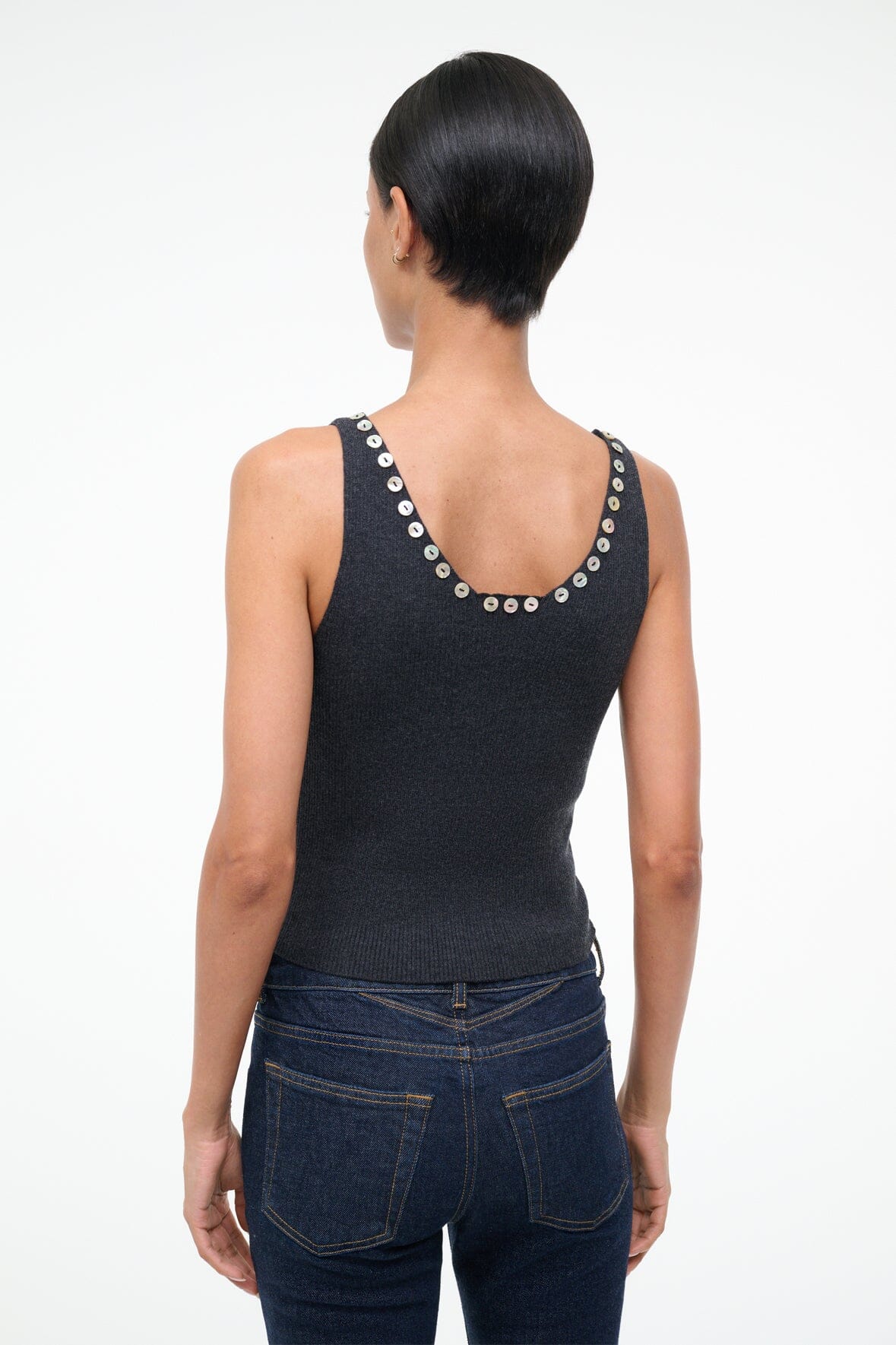 The Neva Tank is a merino wool and cotton blend tank with decorative button detailing along the neckline.