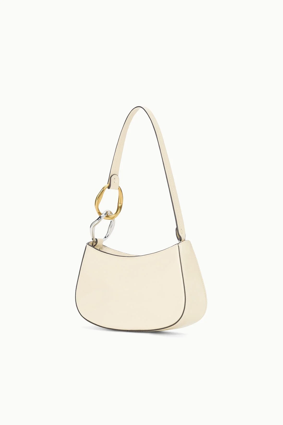 The Ollie Bag is a mini shoulder bag made out of polished leather. This style features a hardware design on the strap and a zip closure.