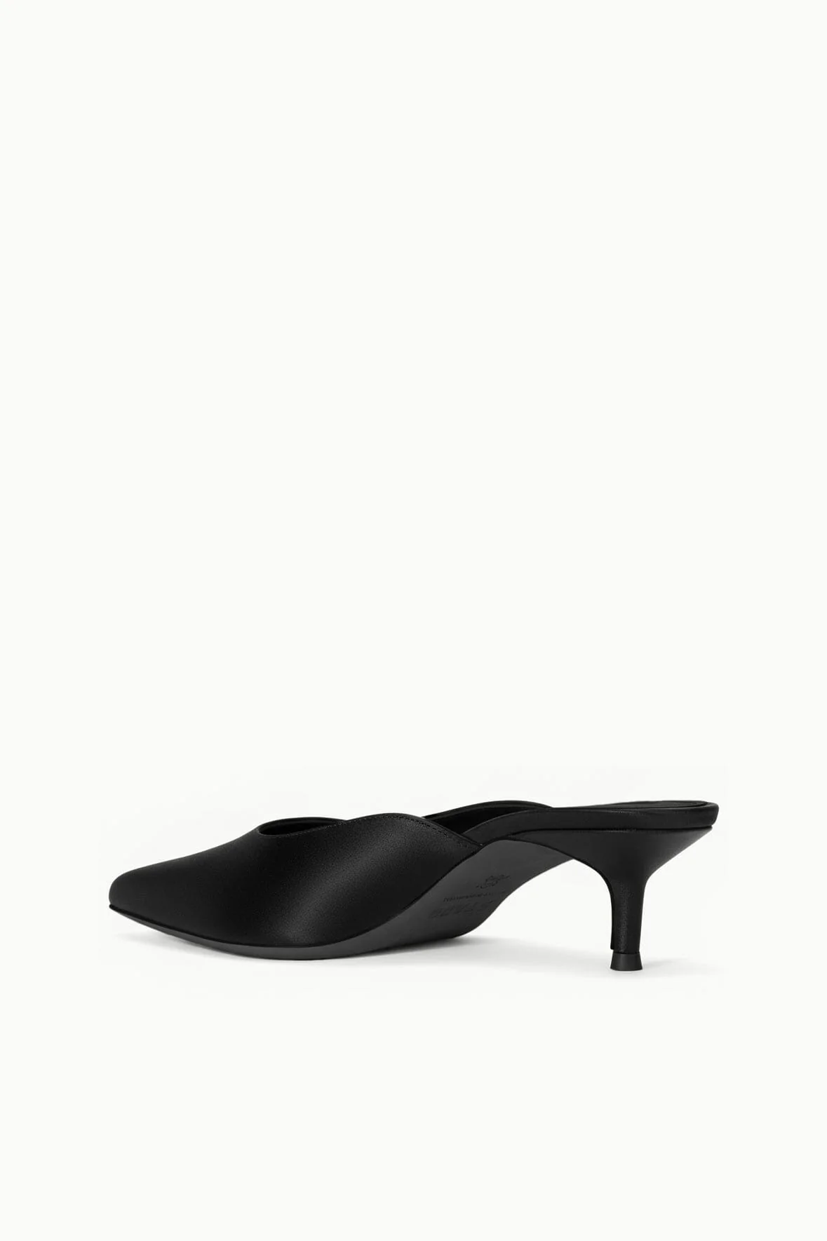 This is a satin pointed toe, kitten heel mule with a square vamp and nappa leather heel.