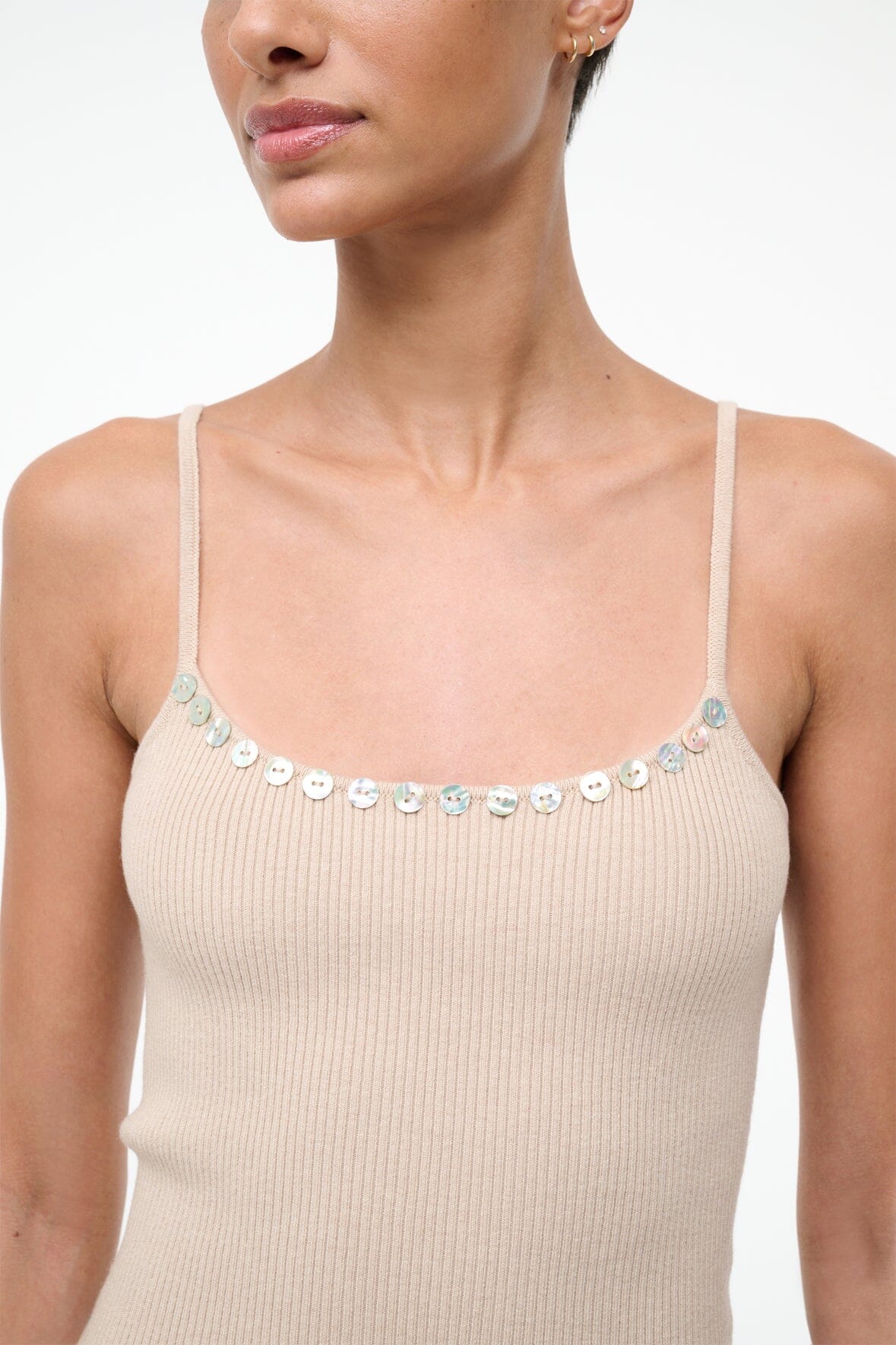 A rib knit camisole, the Soleil is an essential tank for layering with ease. This update features contrast button details at the neckline.Â