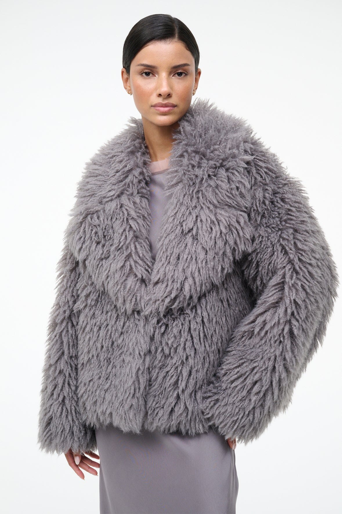 A faux-mongolian fur jacket fashioned after a classic peacoat, the Soprano Jacket featues a notch collar and slightly boxy silhouette.