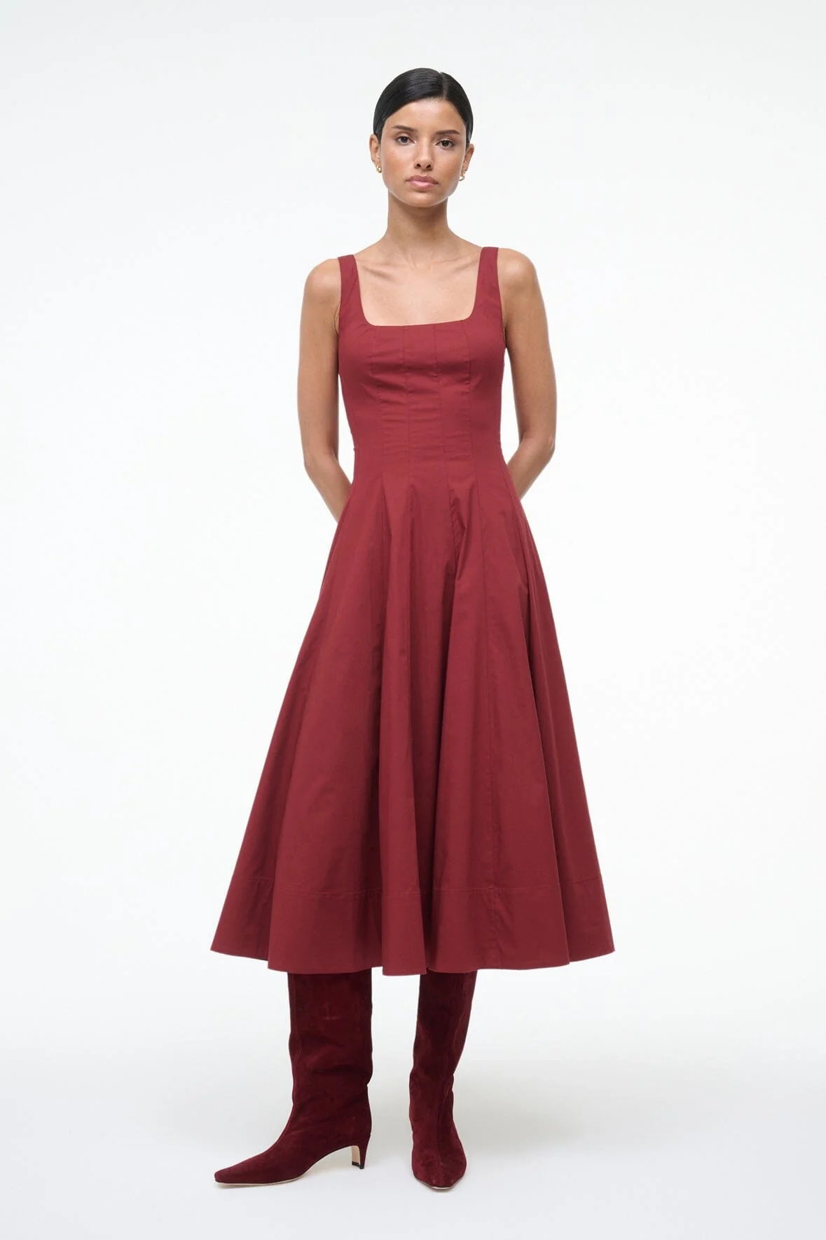 The Wells Dress features a corset-style panel construction to create a flattering, fitted shape through the waist and a full skirt which hits just below the knee. Constructed in lightweight cotton poplin.